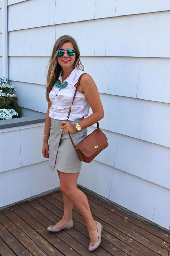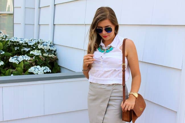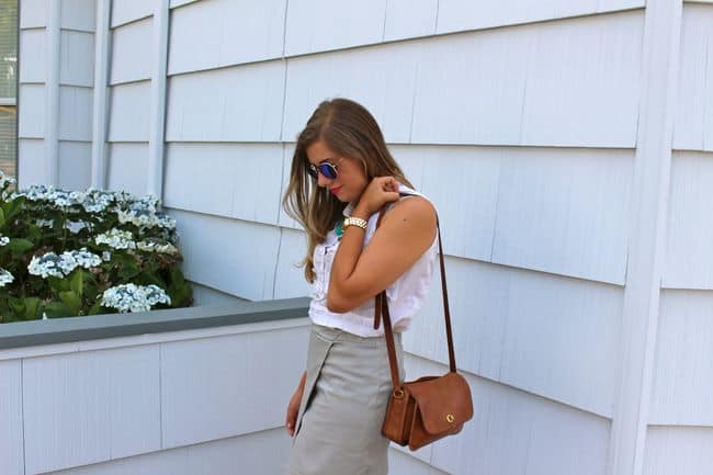 Off WhiteSHIRT: Loft (old, similar here) // SKIRT: Topshop (thrifted, similar here) // BAG: Coach // SHOES: TJ Maxx (similar here) // SUNGLASSES: H&M // NECKLACE: Mimi Scholer (similar here) // WATCH: T+J Design (similar here) // LIPSTICK: Revlon ‘Fuchsia Fusion’